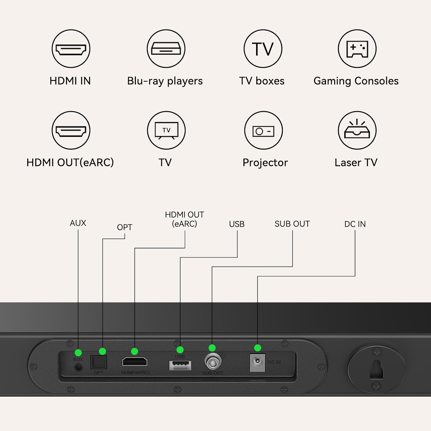 - 4K HDR Soundbar with HDMI Passthrough:Direct 4K HDR signals to your TV via HDMI IN. Sync vivid colors and 3D audio for PS5/Xbox/Blu-ray. Bluetooth 5.3 soundbar pairs with phones/tablets.