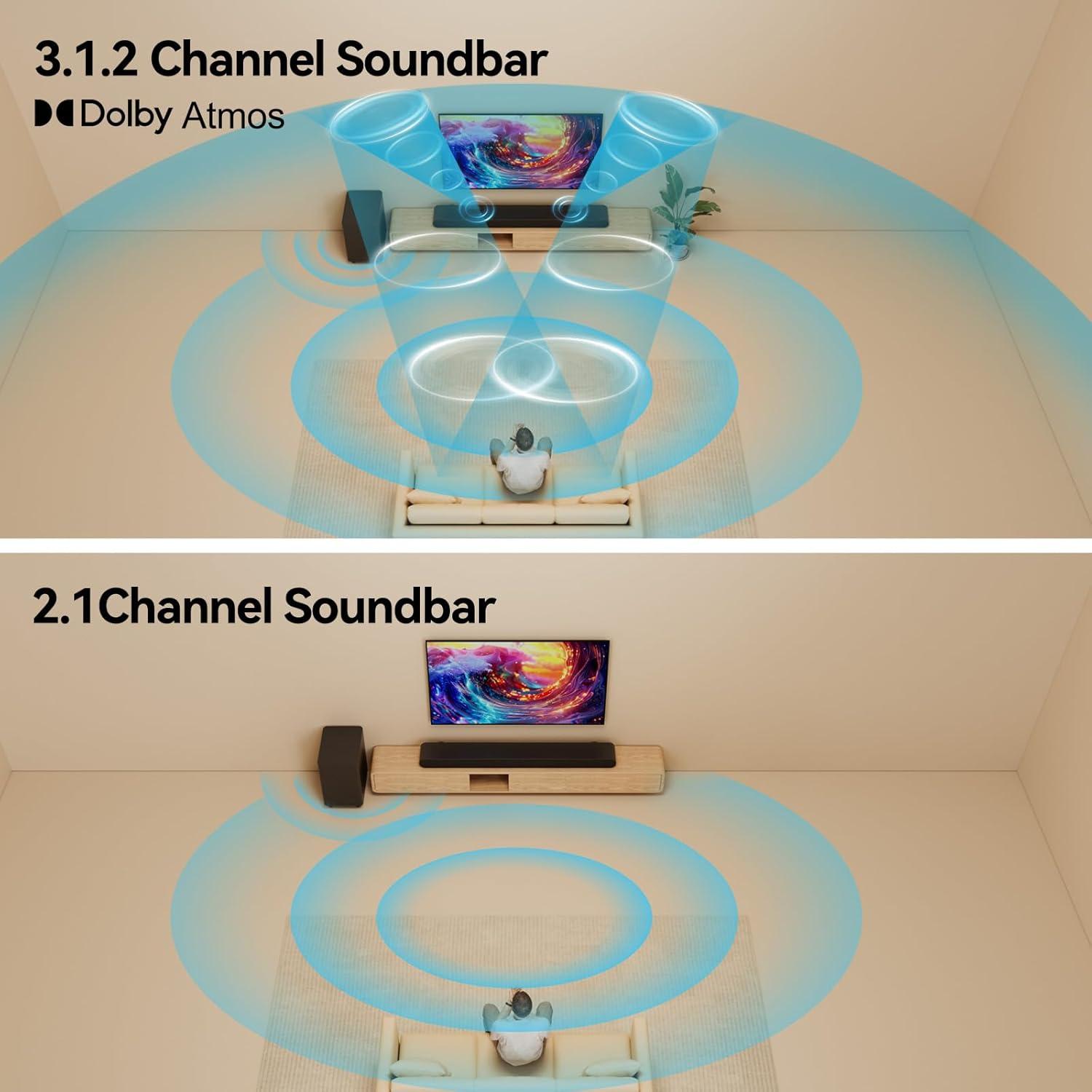 - Vertical Surround Sound Bars for TV:Dual upward drivers bounce sound off ceilings, creating vertical layers (unlike flat TV speakers). Dolby Atmos brings cinema-like depth to your smart TV.